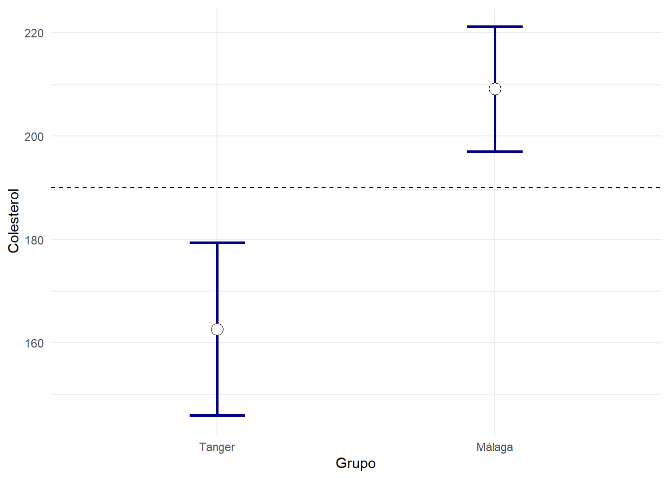 En término de contrastes de hipótesis diríamos que tenemos evidencia estadísticamente significativa de que tanto en Málaga como en Tanger la media de colesterol de las poblaciones donde se han extraído las muestras no es 190, con un nivel de significación del 5%. Este nivel de significación hace el papel de probabilidad de observar unas muestras tan extañas como las observadas si la media fuese 190.