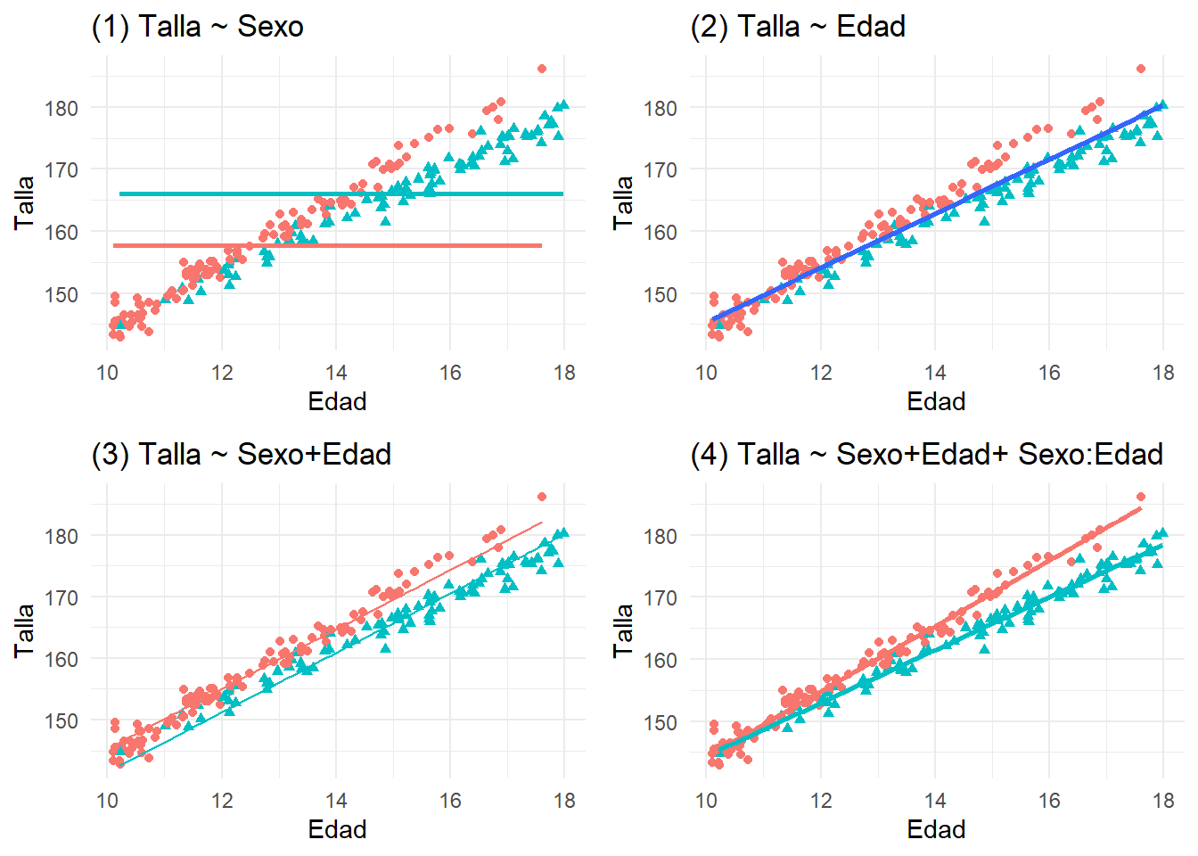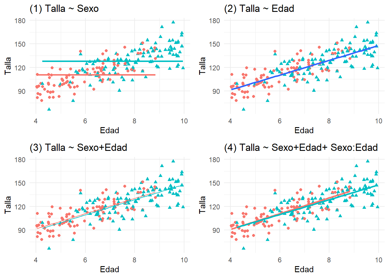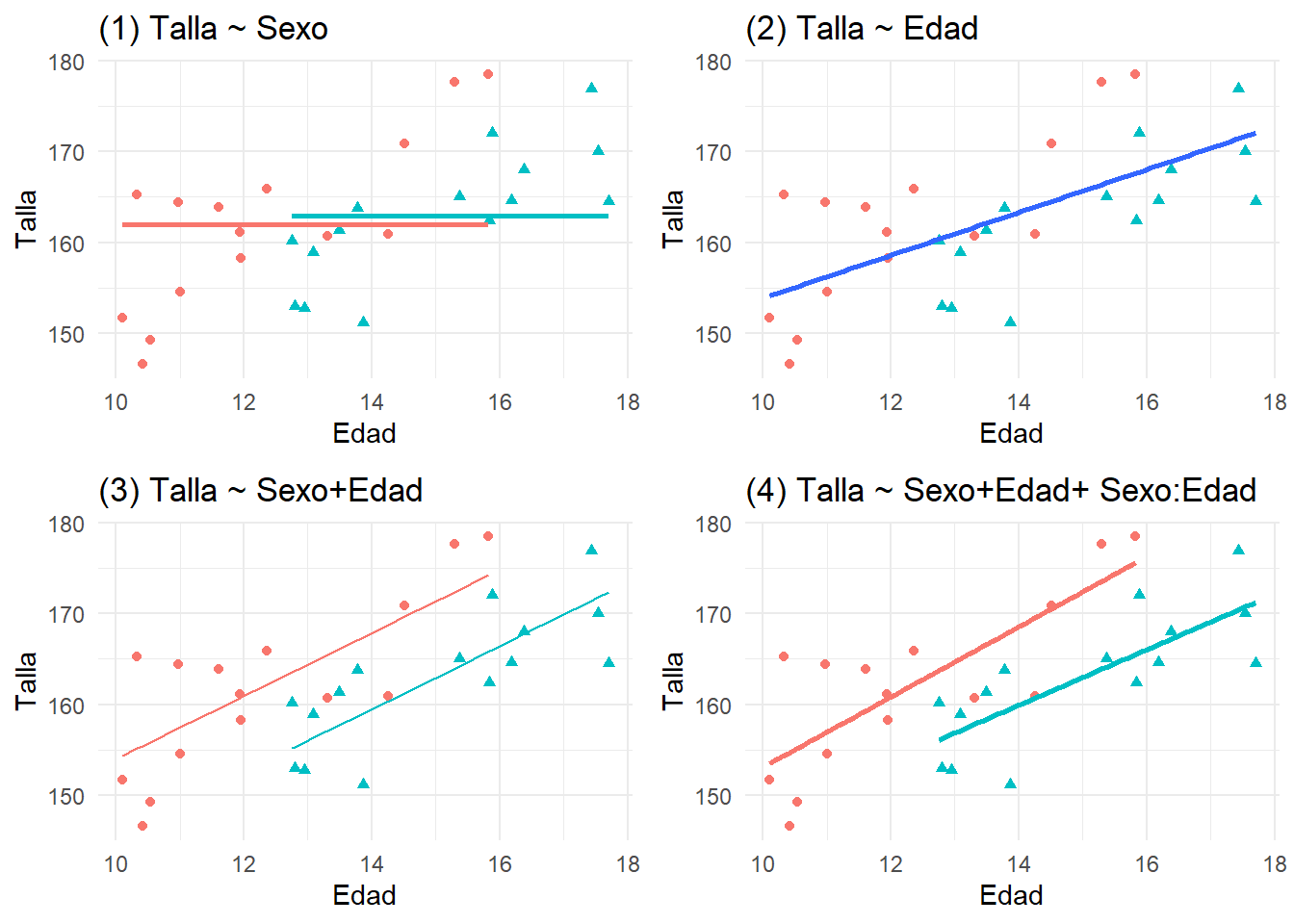 geom_smooth(method = "lm",se=FALSE) +ggtitle("(4) Talla ~ Sexo+Edad+ Sexo:Edad")+ guides(color=FALSE,shape=FALSE)