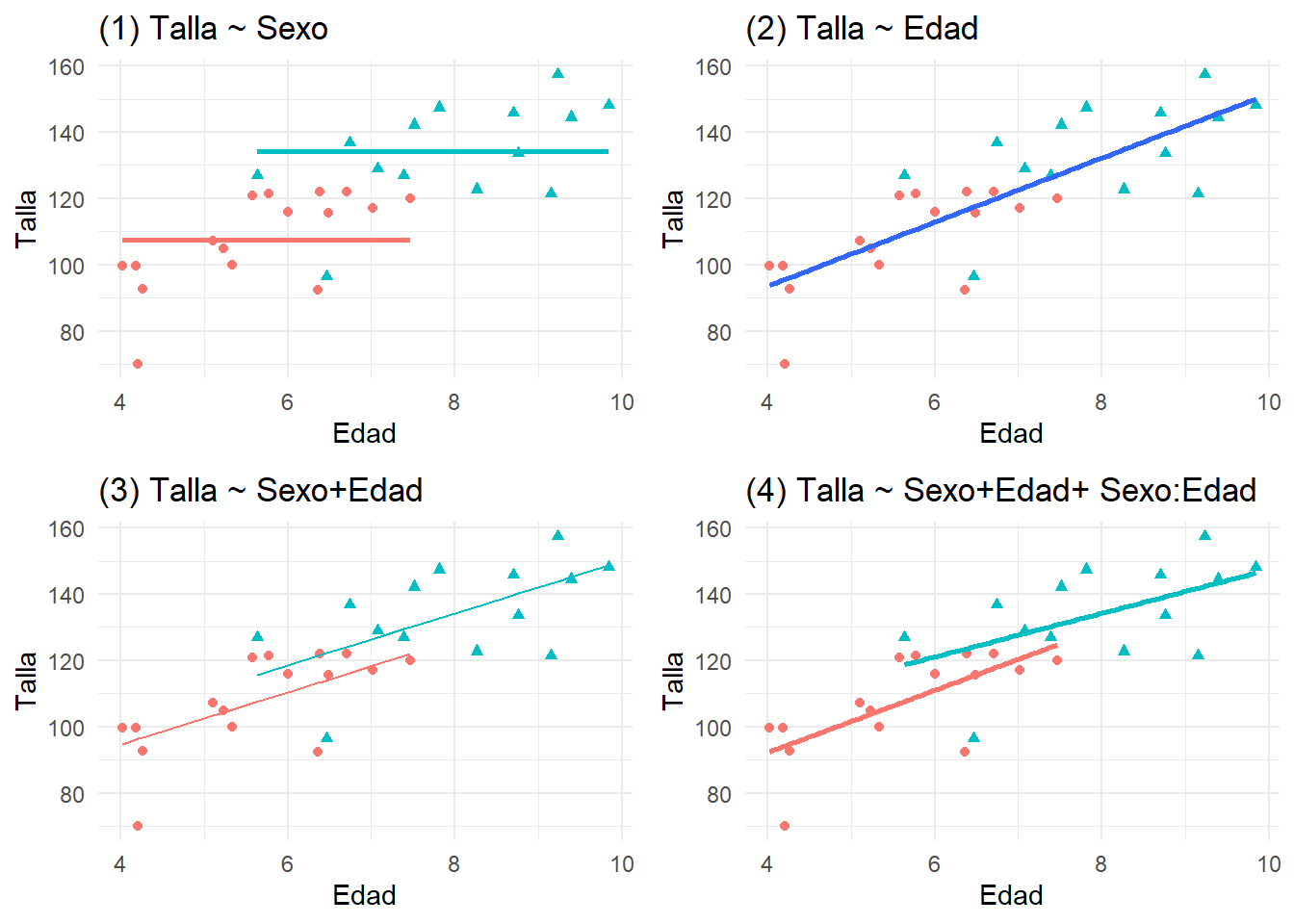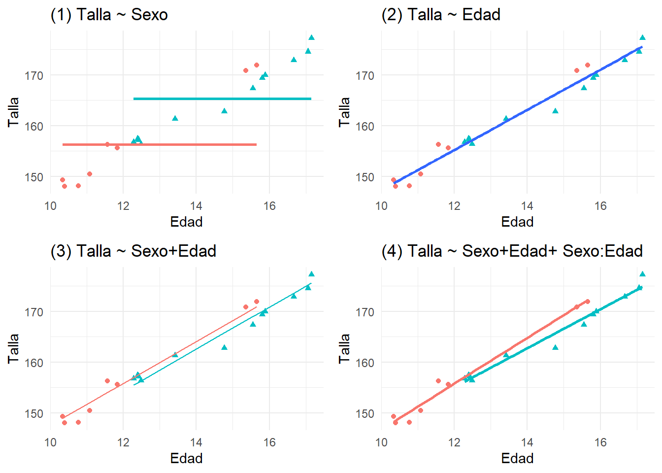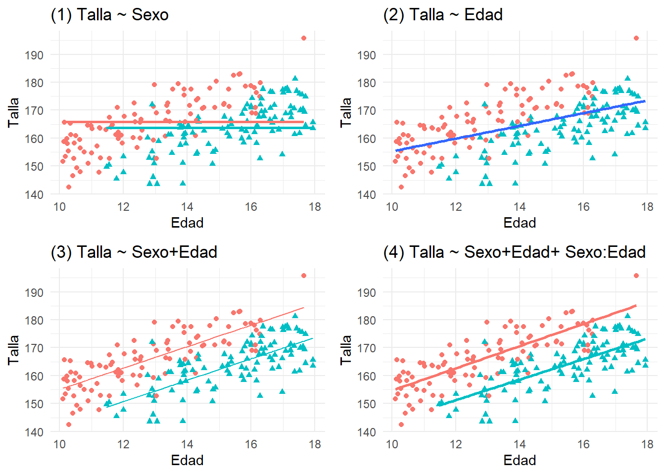 geom_smooth(method = "lm",se=FALSE) +ggtitle("(4) Talla ~ Sexo+Edad+ Sexo:Edad")+ guides(color=FALSE,shape=FALSE)