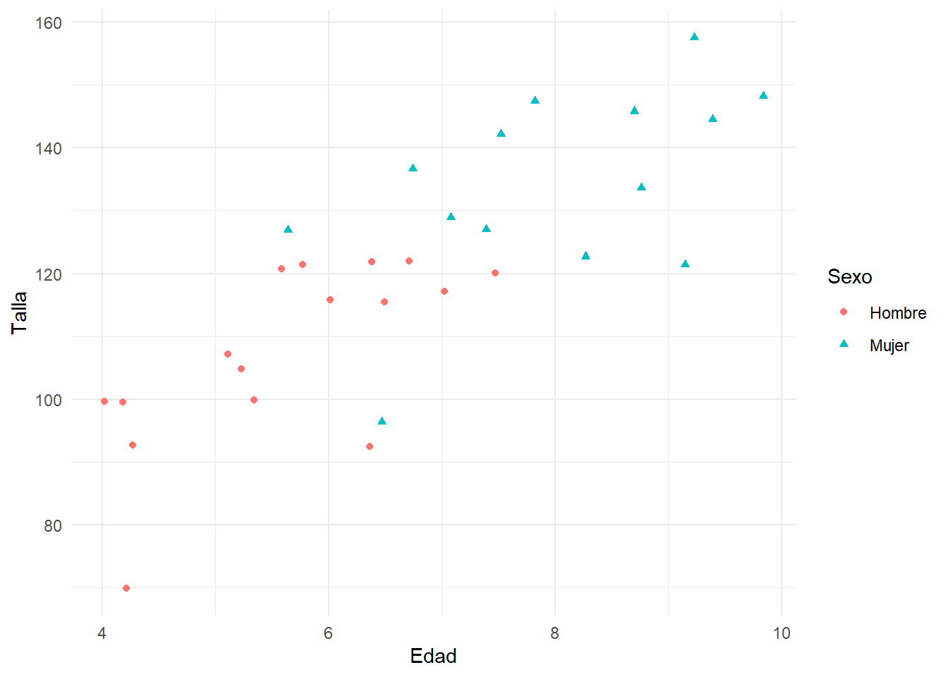 plot_SexoEdad=ggplot(dfAumentado, aes(x=Edad,y=Talla,shape=Sexo,color=Sexo))+geom_point()+